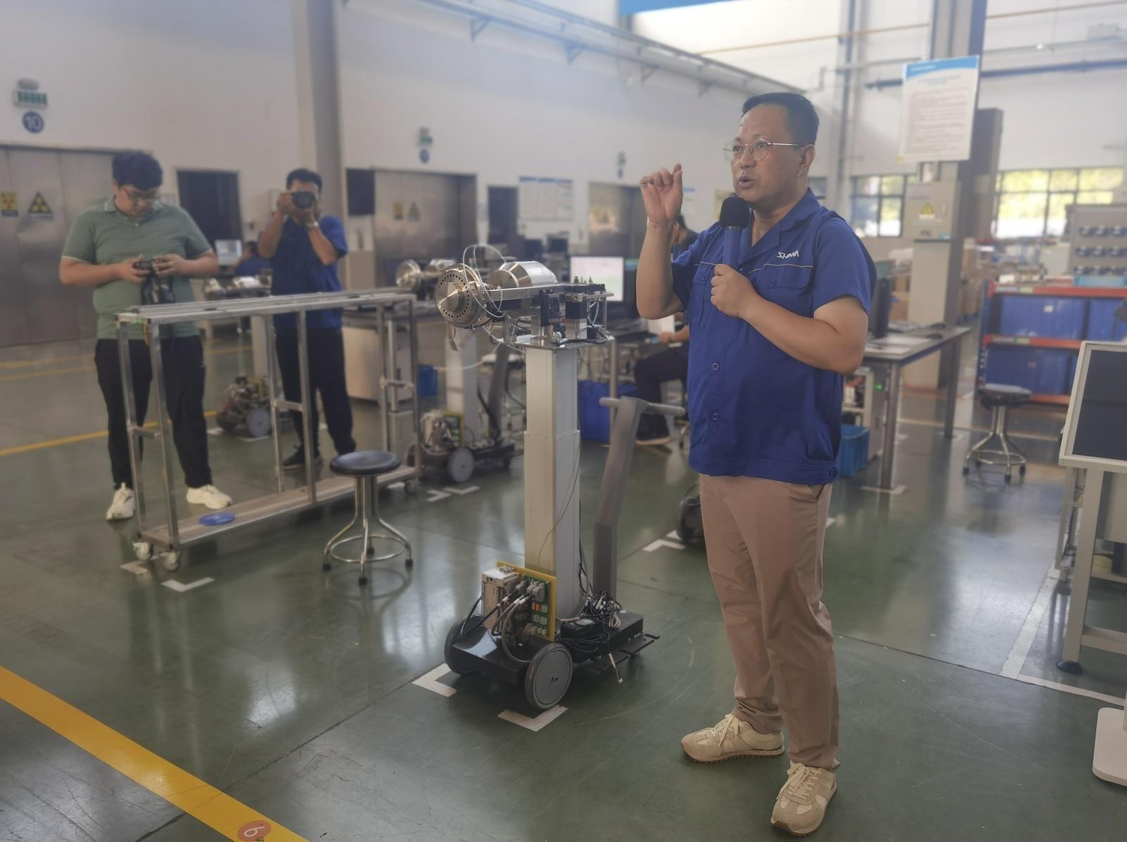 “高质量发展调研行”采访团来到位于山东淄博市的山东新华医疗器械股份有限公司调研,工作人员王波在进行讲解