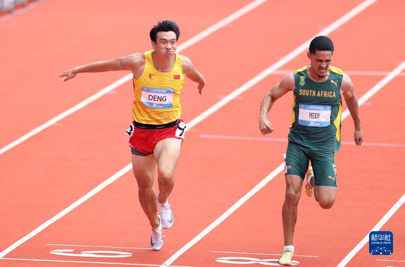8月1日,中国选手邓智舰(左)在男子100米预赛中冲线。最终,他以10秒47的成绩晋级半决赛。新华社记者 贾浩成 摄