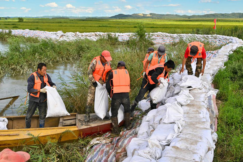 8月12日,红旗种畜场农民在松花江边加固堤坝。新华社记者 陈益宸 摄