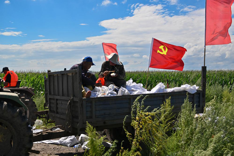 在码垛现场,宋春哲和农民边春雷正合力将一个沙袋装入拖拉机后斗。边春雷感慨地说:“我在这里有五垧地,从抗洪抢险到现在,我们的庄稼一粒都没有受灾,现在很有安全感。支部带领我们冲锋在抗洪第一线,我们心里高兴。不管在哪里,他们都是冲锋在现场,冲锋在第一线。”