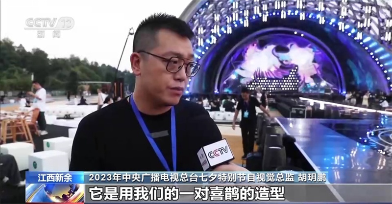 2023年中央广播电视总台七夕特别节目视觉总监 胡玥鹏:整个主舞台的LED屏,用一对喜鹊的造型来作为主造型,每个节目都要依据我们现在舞美的造型来做设计。同时我们设计了一个新媒体互动装置的树,来作为整个舞台的前景,它既承载着一个表演空间,又有很好的一个寓意。
