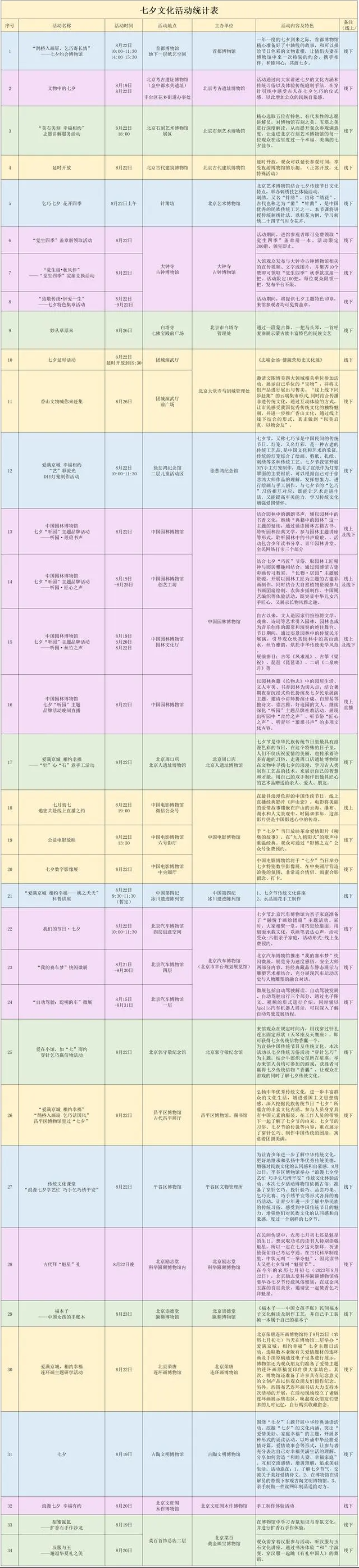 七夕节当天,首都博物馆精心准备了中轴线的故事,以及可以描绘节日色彩的文物素模,邀请情侣、夫妻在博物馆中来一次特别的约会,共同品味文物故事,参与手工互动体验。北京艺术博物馆将举办“乞巧七夕 花开四季”刺绣技艺体验活动,观众可以在万寿寺的古建筑中,学习刺绣二十四节气时令花卉,感受七夕传统习俗。北京周口店北京人遗址博物馆将举办“‘针’心‘石’意手工活动”,观众可以在文物中寻找七夕的浪漫,学习古人类制作工艺品的技术,为亲友送上一件手作艺术品。