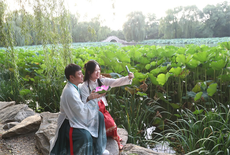 8月20日,身着汉服的游客手拿荷灯合影。中国日报记者 邹红 摄