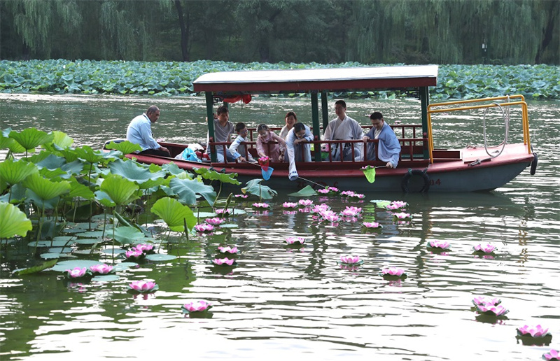 8月20日,游客放荷灯寄托对美好生活的祝愿。中国日报记者 邹红 摄