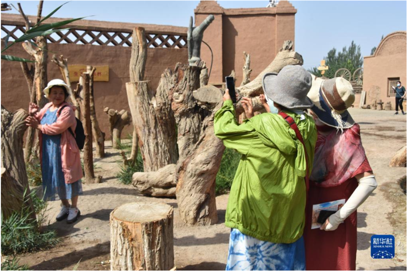 8月30日,游客在位于新疆吐鲁番市的坎儿井乐园景区拍照留念。