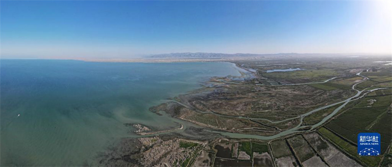 8月31日拍摄的新疆博斯腾湖大河口景区(无人机全景照片)。
