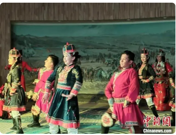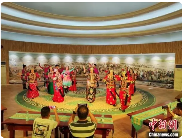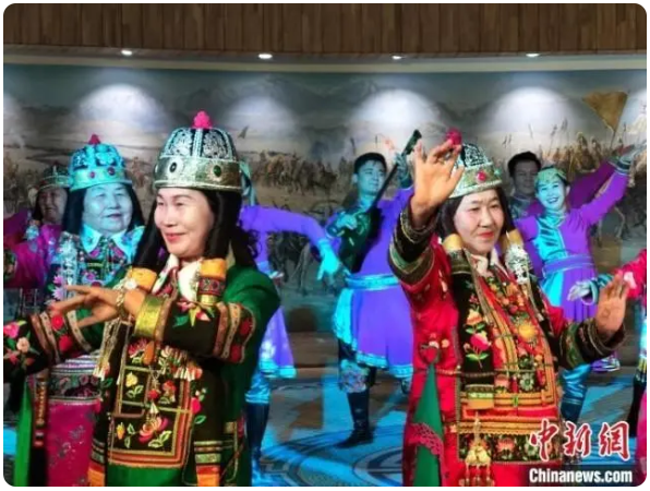 在博湖县蒙古族非遗传承保护中心,民间艺人们身穿华丽的民族服饰,伴随着欢快的音乐,抖肩、弯腰、翻掌,表演萨吾尔登舞蹈,惟妙惟肖的舞姿、欢快强劲的节奏,为现场观众带来了一场精彩绝伦的视觉盛宴。