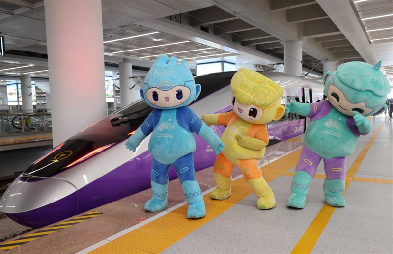 8月4日,在浙江省杭州西站,杭州亚运会吉祥物“琮琮”“莲莲”“宸宸”与复兴号亚运智能动车组列车合影留念。新华社发(谢尚国摄)