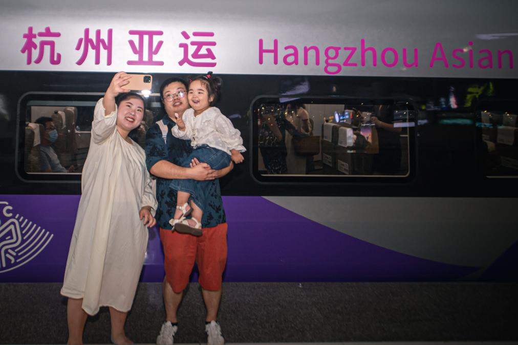 9月16日,在杭州东站站台,乘客与复兴号亚运智能动车组列车合影留念。 新华社记者 江汉 摄
