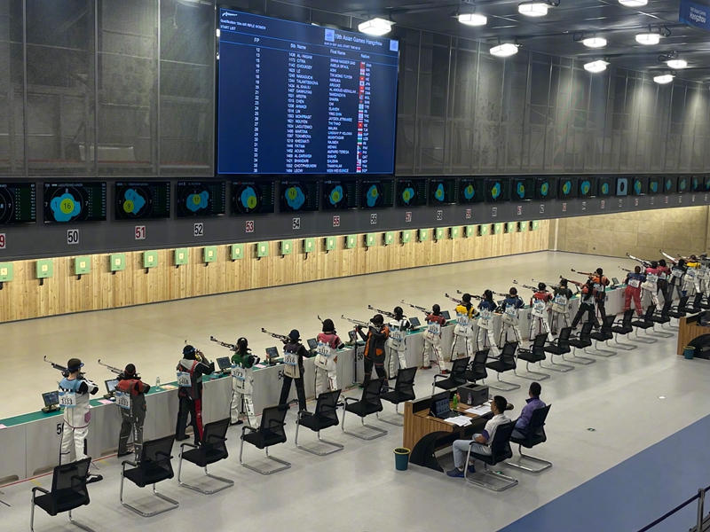 24日,在杭州亚运会射击女子10米气步枪团体赛中,中国选手黄雨婷、韩佳予、王芝琳出战,夺得冠军,这是中国射击队在杭州第19届亚运会夺得的首枚金牌!(记者:郑梦雨 林德韧 王春燕)