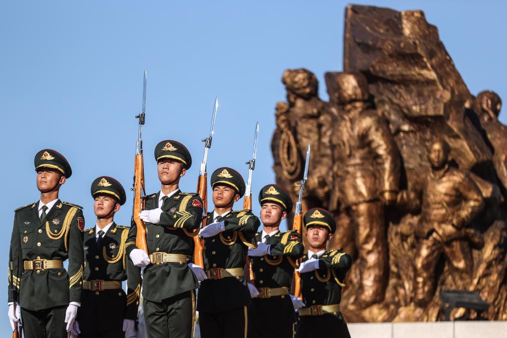 2020年10月23日,在丹东抗美援朝纪念塔敬献花篮仪式上,礼兵在仪式中准备。