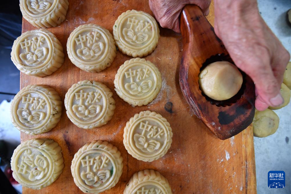 9月20日,在河北省石家庄市井陉县天长镇的一家手工月饼作坊里,老师傅使用传统手艺制作月饼。
