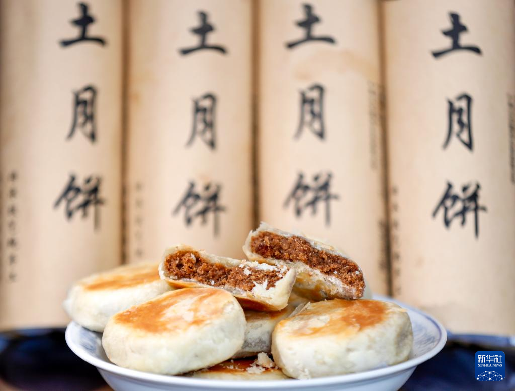 9月19日,在安徽省黄山市徽州区澄塘村一家月饼作坊,工人展示刚刚烘烤出的火腿土月饼。