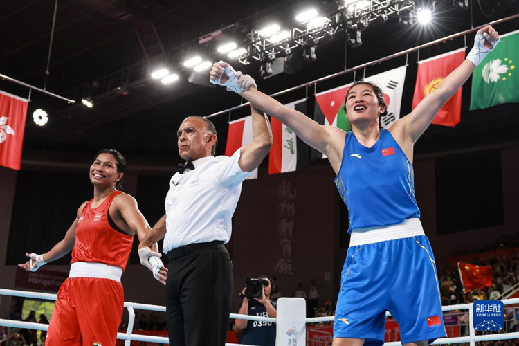 当日,在杭州亚运会拳击项目女子75公斤级决赛中,中国选手李倩战胜印度选手洛夫利娜·博尔戈哈因,获得冠军。