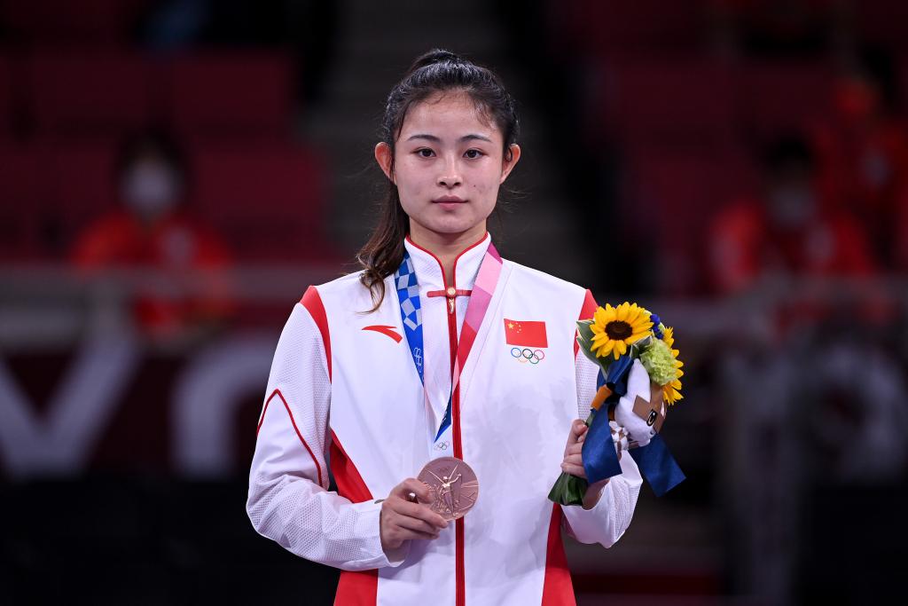 2021年8月7日,在东京奥运会空手道女子组手61公斤以上级半决赛中,龚莉不敌阿塞拜疆选手伊琳娜,获得季军。图为龚莉在颁奖仪式上。新华社记者杜宇摄