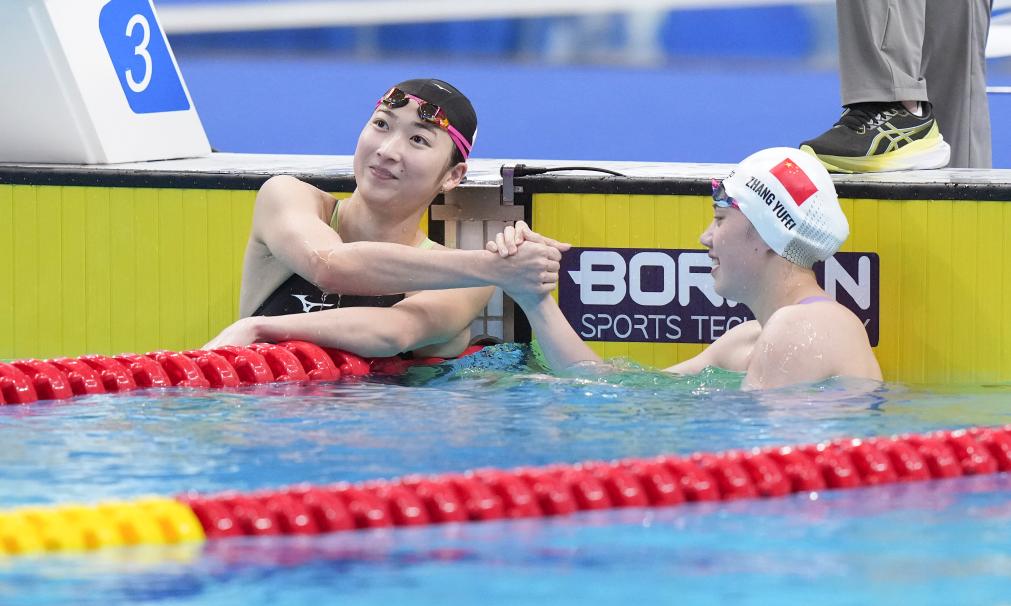 9月29日,中国选手张雨霏(右)与日本选手池江璃花子在比赛后。新华社记者 杜宇 摄