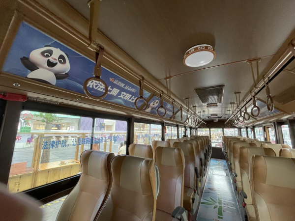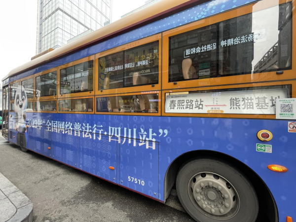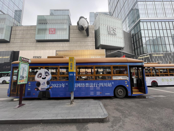 据介绍,未来一个月时间里,成都市民和来蓉游客都能在春熙路商圈的“网红”地标“熊猫爬墙”下,看到网络普法主题公交。该主题公交在成都著名的“熊猫观光线”上运行,并往返于成都地标春熙路以及热门景点熊猫基地,途经宽窄巷子、文殊院等人气打卡地,公交车化身普法“宣传员”,让网络普法宣传融入城市交通、深入大街小巷、进入百姓心中。