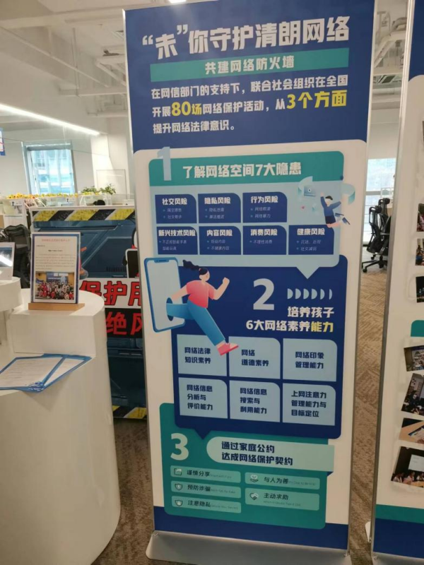 在营地走廊里,两旁的“条漫展架”以漫画形式介绍聚焦各种真实的网络举报案例,并延展到网络保护法治宣传。