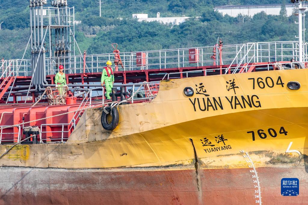 10月17日,在中国石化集团重庆川维化工有限公司物流码头,工作人员在检查出口产品装船情况。