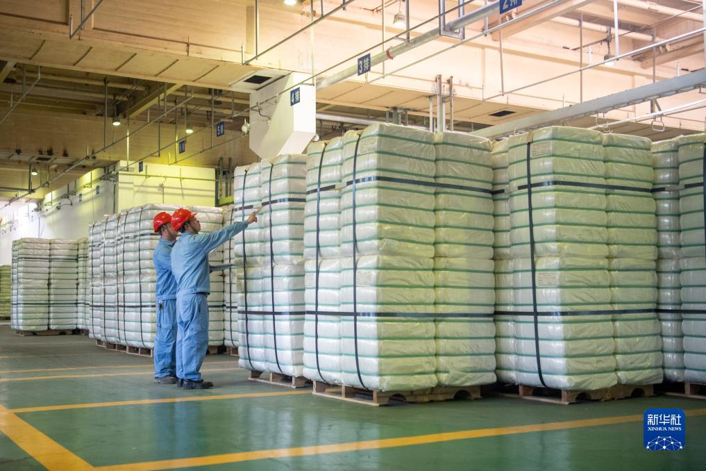 10月17日,在中国石化集团重庆川维化工有限公司,工作人员在查看产品打包情况。