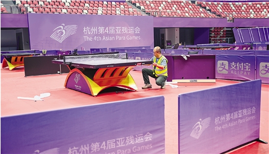 杭州拱墅运河体育公园体育馆是杭州亚残运会乒乓球项目的比赛及训练场馆,目前场馆转换工作已基本就位。记者 董旭明 摄