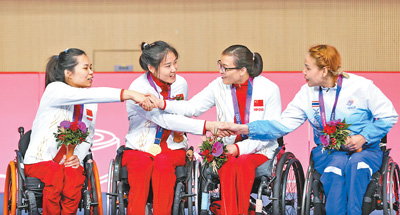 杭州亚残运会轮椅击剑女子花剑个人B级决赛,中国体育代表团运动员和泰国体育代表团运动员(右)在颁奖仪式上握手致意。新华社记者 胡星宇摄