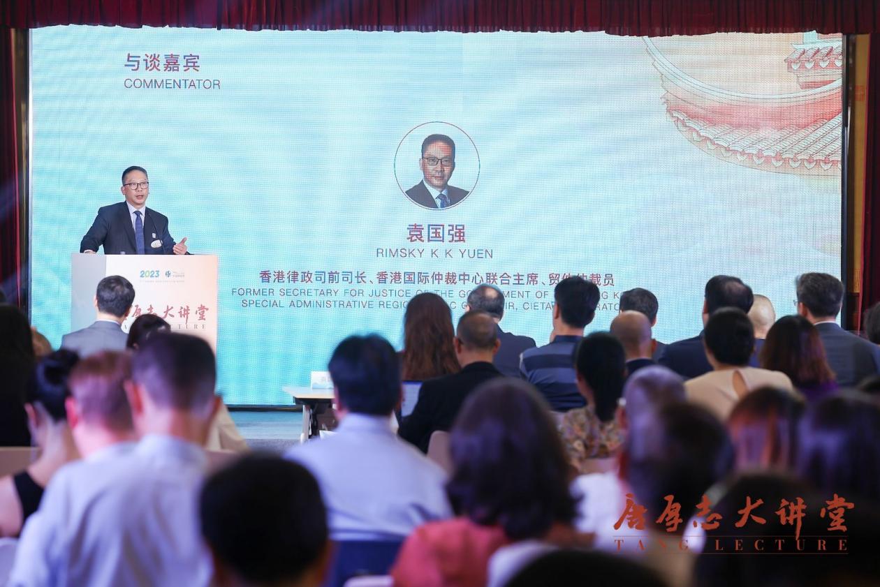 随后,香港律政司前司长袁国强作为与谈人发言。他从微观和宏观两个视角对王轶教授的演讲进行了回应。在微观上,他提出在数据属性、数据利益的分配以及涉数据问题的法律规范类型等问题上,尚待进一步研究;在宏观上,数据和先进科技的关系也值得深思,亟需研究科技将如何影响争议解决进而影响公正。