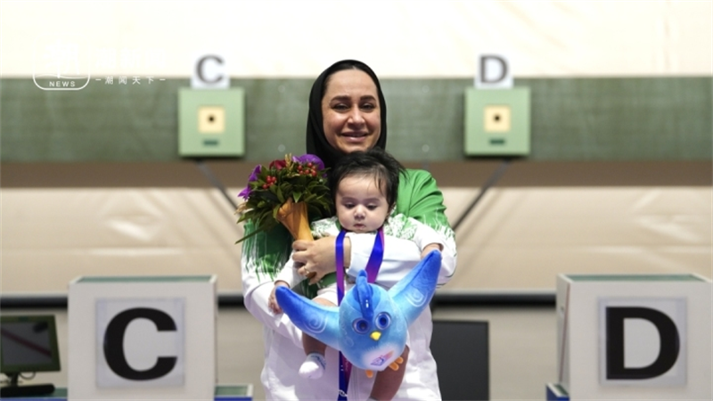 10月24日傍晚,富阳银湖体育中心,杭州亚残运会射击项目SH1级女子10米气手枪颁奖仪式上,银牌得主、杭州亚残运会伊朗代表团射击运动员萨雷赫•贾万马尔迪一出场,就引得现场一片欢呼。