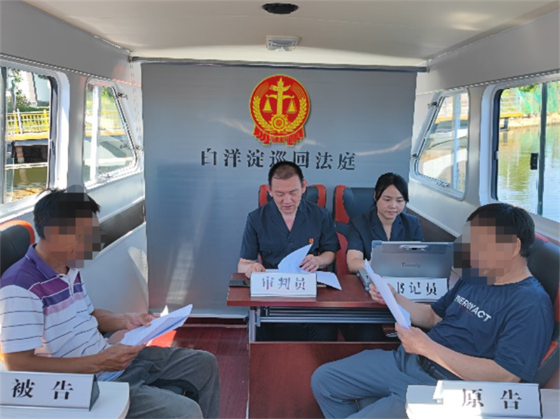 图为审判员在“天平号”上开展巡回审判。安新县人民法院供图
