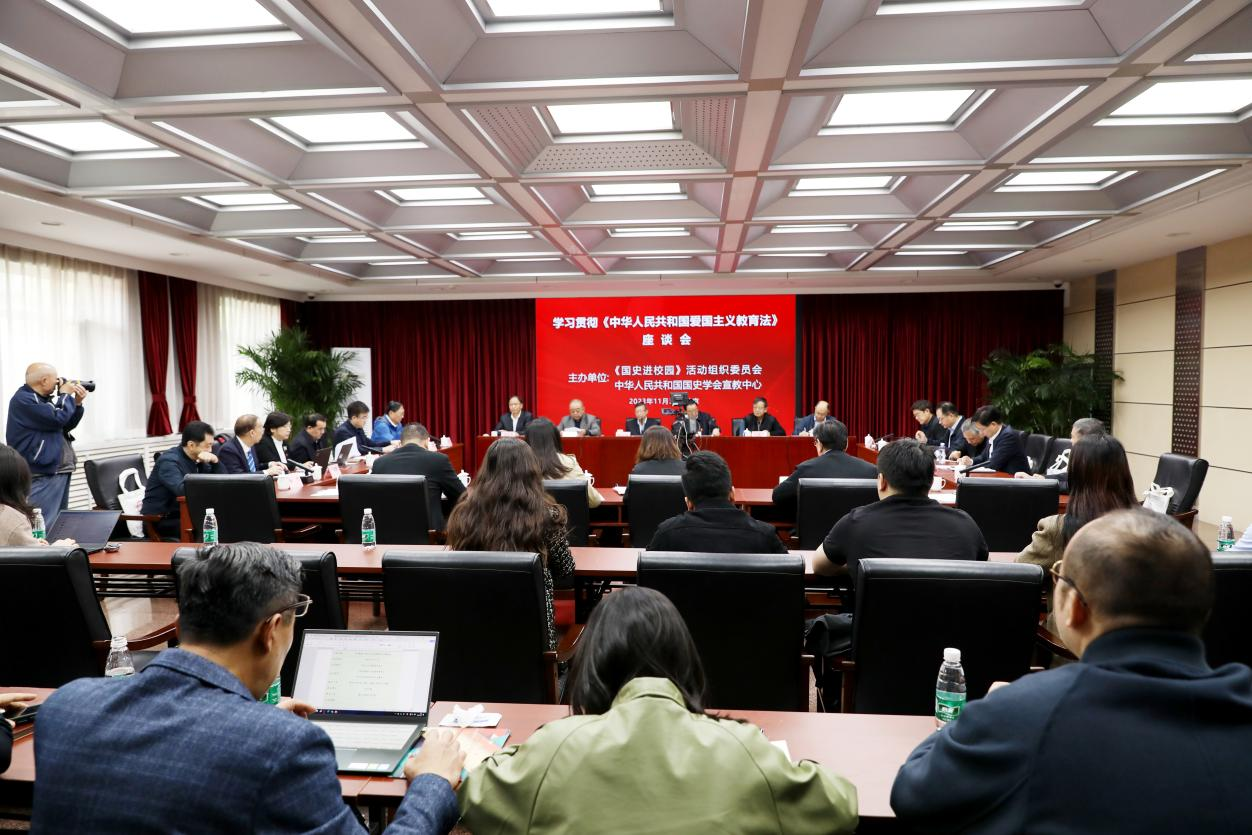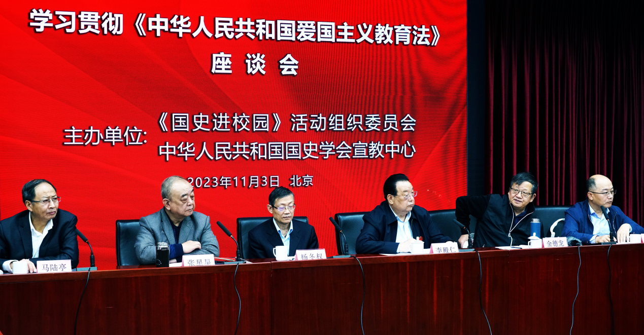 座谈会由中华人民共和国国史学会秘书长张星星主持,中国高等教育学会学术发展咨询委员会副主任、秘书长马陆亭和国家开放大学宣传部(新闻中心)部长徐明军分别代表主办单位致辞。国防大学原副政委、中将、国史进校园活动特邀专家李殿仁,中央档案馆原馆长、国家档案局原局长、国史进校园活动特邀专家杨冬权,国家广电总局原副总编辑、重大题材办公室主任金德龙,中央党史和文献研究院七部副主任班永吉,新华社中国图片社党委书记、董事长段芝璞,中宣部学习出版社原社长董俊山,光明日报出版社总编辑邓永标,中国社会科学院金融所党委书记龚云,北京大学中共党史研究中心主任程美东,中国人民大学中共党史党建研究院党委书记宋学勤,北京理工大学教育部课程思政示范中心主任李小平,北京经济管理职业学院党委书记陈刚,温州肯恩大学党委副书记严晓鹏,北京德艺双馨公益基金会理事长范晓伟等同志,围绕对《中华人民共和国爱国主义教育法》的思考、体悟、贯彻、实施等进行交流发言。大家一致认为,爱国主义教育法的颁布和实施,对于加强新时代爱国主义教育,传承和弘扬爱国主义精神,凝聚全面建设社会主义现代化国家、全面推进中华民族伟大复兴的磅礴力量具有重要意义。