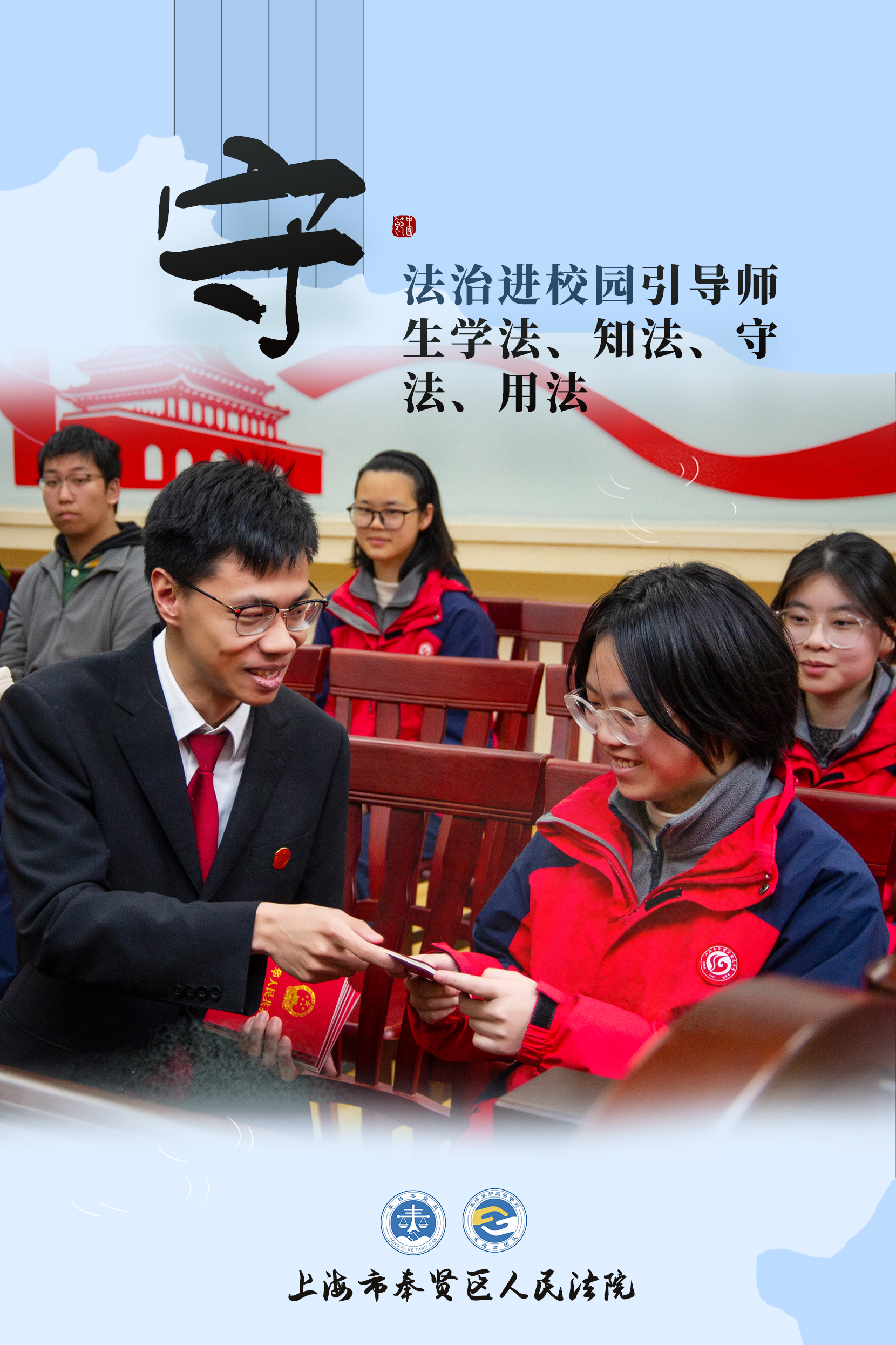 在上海市奉贤法院奉城法庭的法治进校园教学点——奉城镇曙光中学内,法官助理正在向高二的同学们分发宪法宣传册,并通过释法析理引导同学们学法、知法、守法、用法,在心中播下法治的种子。