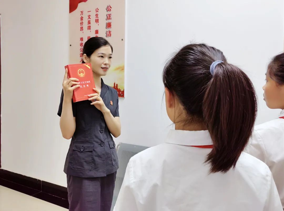 ▲郑州市金水区人民法院举办开放日活动,为前来参观的学生讲解民法典。