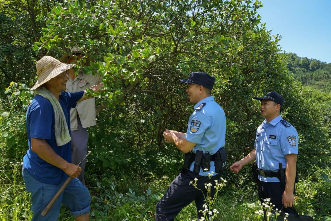 ▲信阳市公安局民警深入茶园,调查走访辖区群众,排查化解矛盾纠纷。