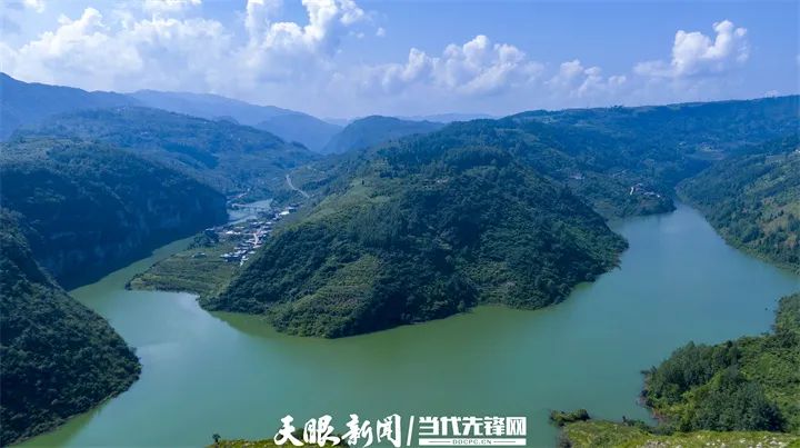 位于乌江源的毕节市纳雍县姑开乡引底河呈现高峡平湖景观,河面在蓝天白云、青山绿树映衬下美如画。张晓勇 摄