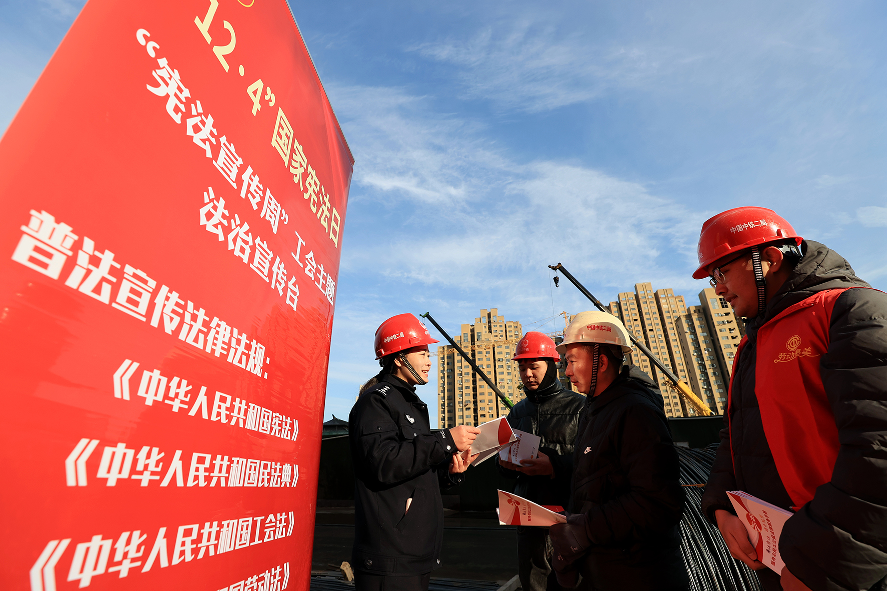 11月30日,安徽省淮北市总工会组织志愿者来到建筑工地,向建筑工人发放法律读本,讲解法律知识,提供法律咨询,教育引导他们学法、守法,依法维护自身合法权益。