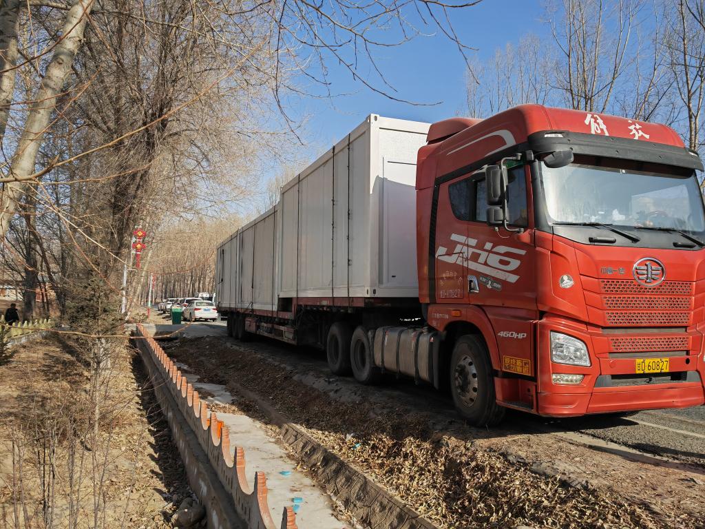 装着集装箱式彩钢板房的物资车运抵积石山县刘集乡陶家村。新华社记者 王朋 摄