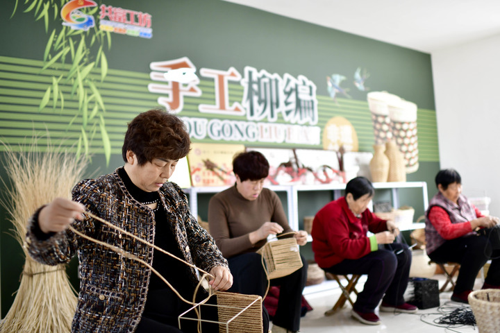 在东营市东营区龙居镇“共富工坊”,村民加工柳编产品。新华社记者郭绪雷 摄
