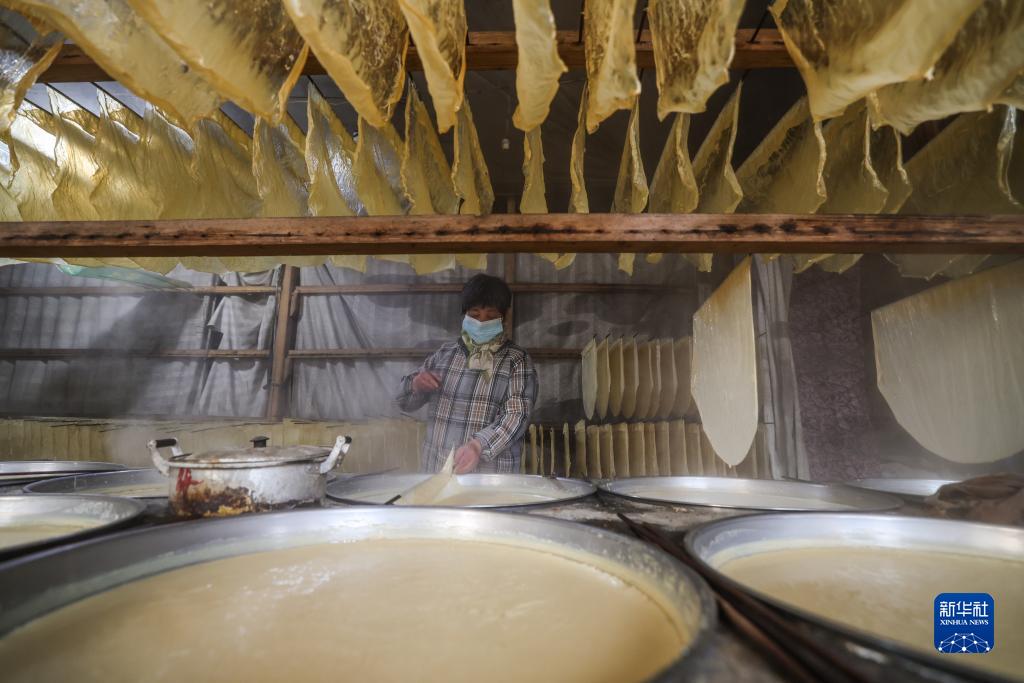 春节临近,浙江省诸暨市安华镇的传统年货——豆腐皮迎来销售旺季。村民加紧制作豆腐皮,供应节日市场。