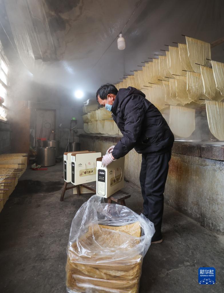 1月16日,在诸暨市安华镇勾乘山村,宣章苗在打包晾干的豆腐皮。