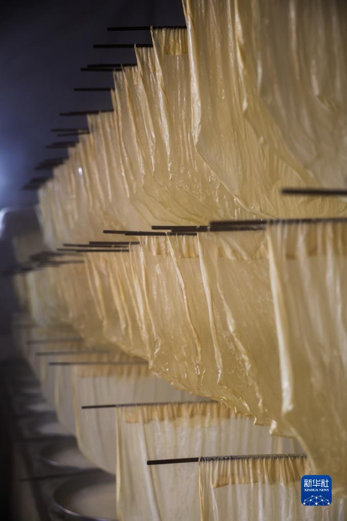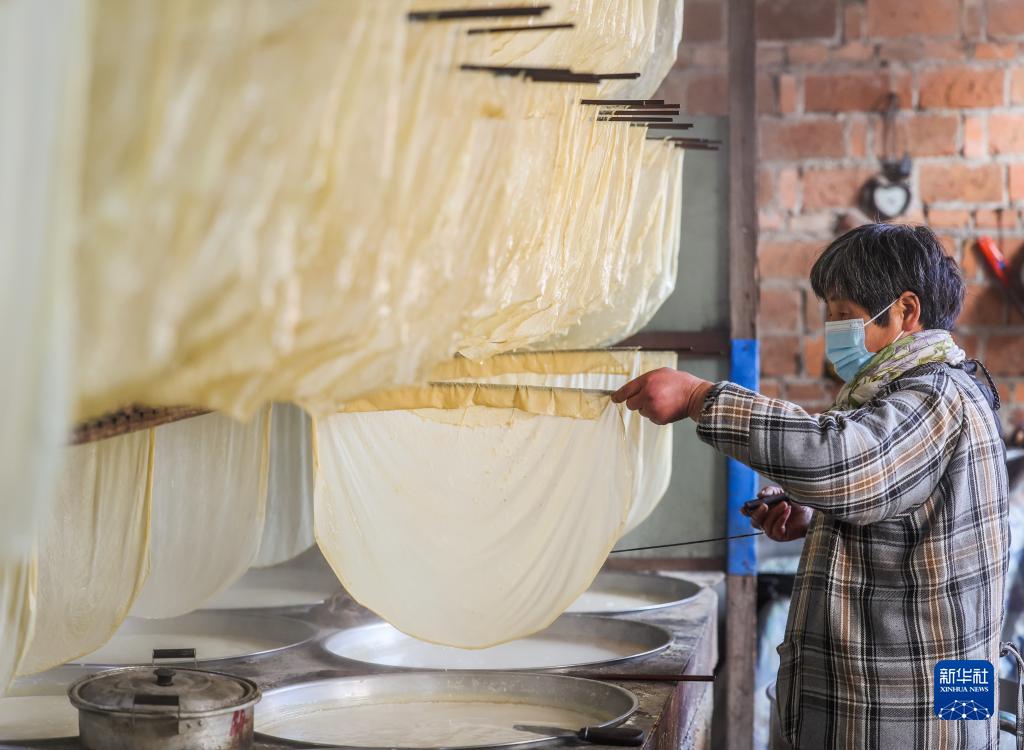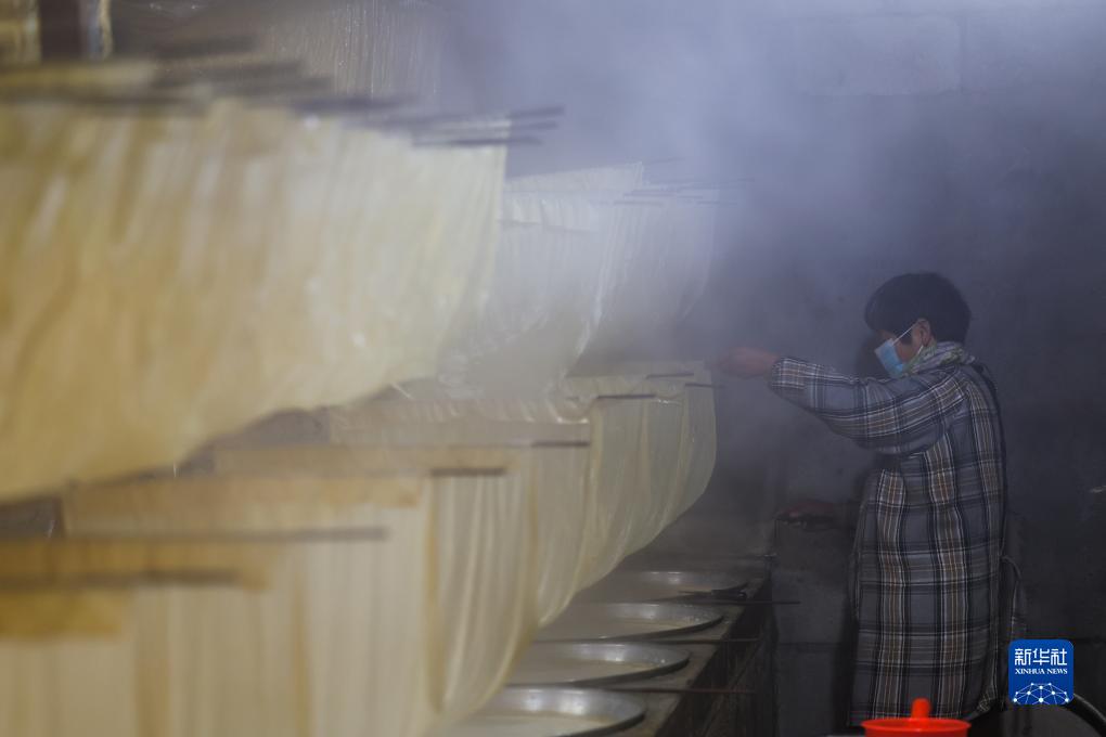 春节临近,浙江省诸暨市安华镇的传统年货——豆腐皮迎来销售旺季。村民加紧制作豆腐皮,供应节日市场。