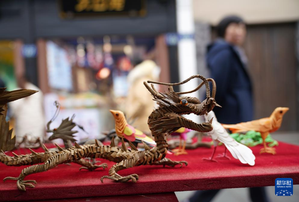 杭州河坊街商户摊位上的棕编龙手工艺品(1月15日摄)。
