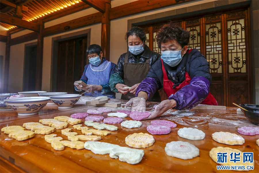 1月18日,在安徽省黄山市徽州区潜口镇潜口村,村民在制作多彩徽州米粿。