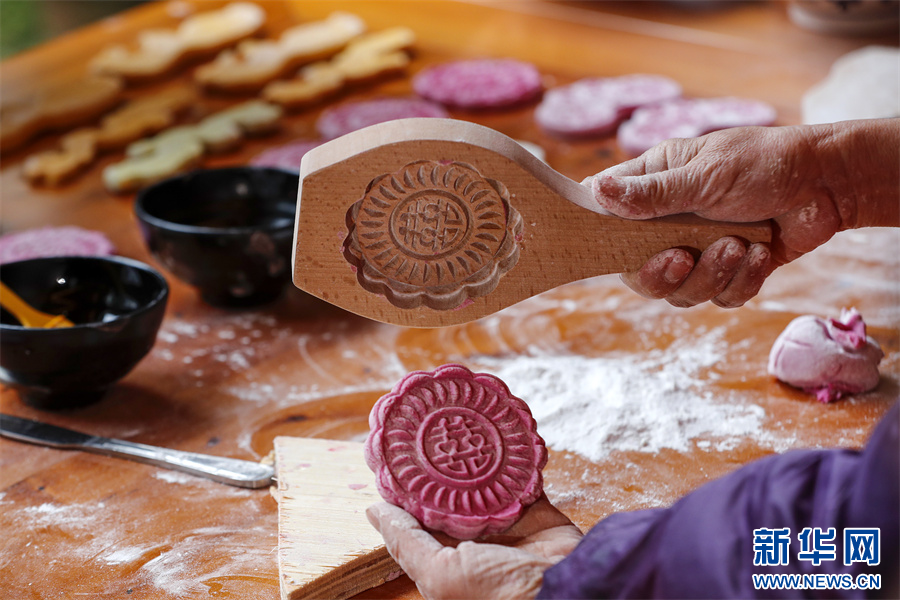 1月18日,在安徽省黄山市徽州区潜口镇潜口村,村民用模具制作的多彩徽州米粿。