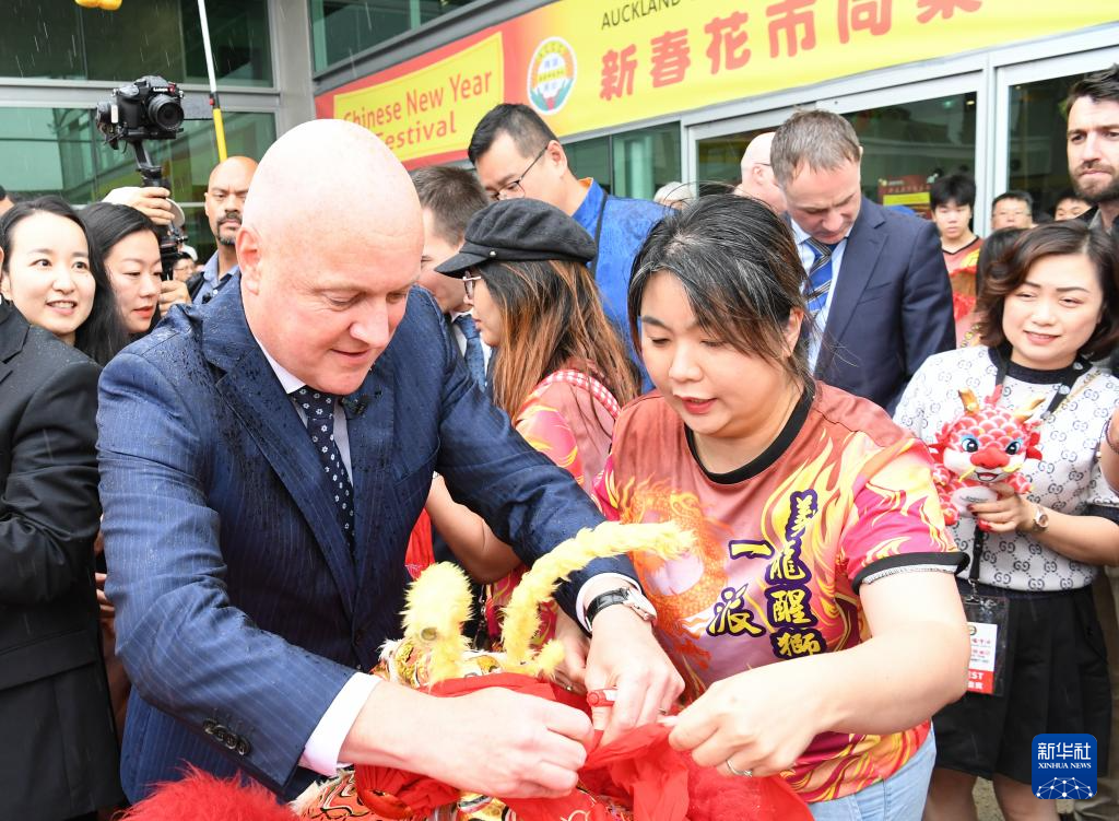 2月3日,新西兰总理拉克森(前左)参加在奥克兰举行的“新春花市同乐日”活动,与数千名当地华人共迎龙年新春。这是拉克森去年11月就任总理以来首次参加当地华人社区大型活动。新华社记者 郭磊 摄
