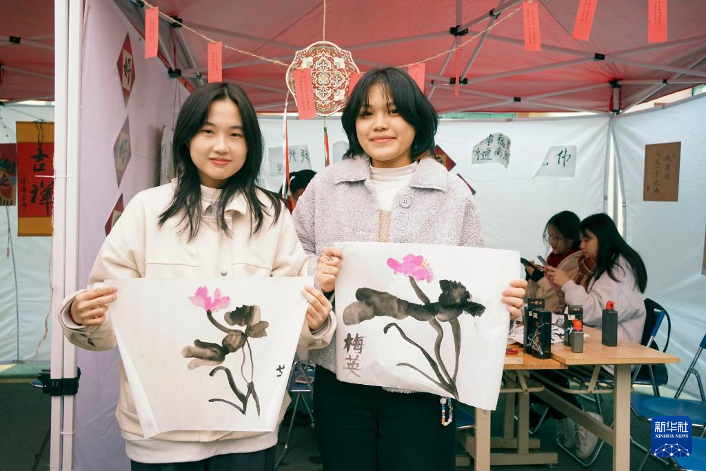 1月24日,“欢庆春节暨中越年俗文化交流体验”活动在越南河内的河内大学举办,约500名学生及社会各界人士参加了书法、中国画、剪纸、奥黛汉服秀和歌舞表演等体验活动,还品尝了春卷、粽子、饺子、汤圆等传统美食。这是两名越南学生在活动中展示自己绘制的中国画作品。新华社记者 胡佳丽 摄