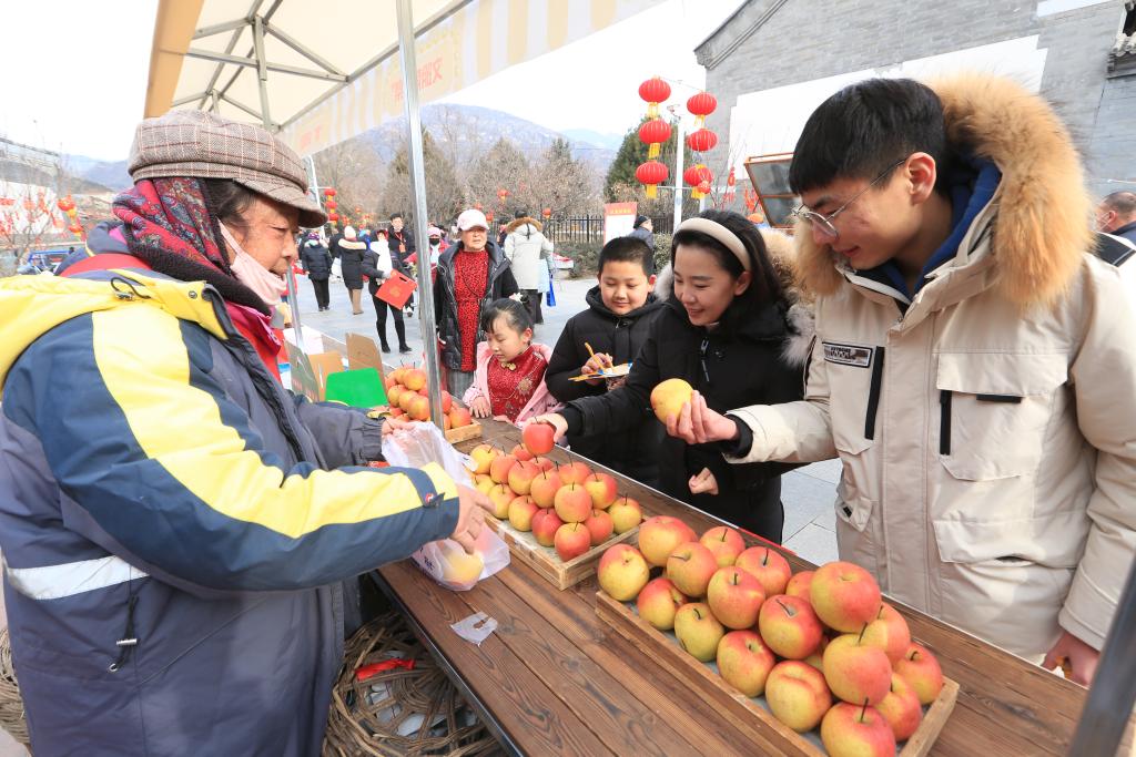 图为游客在怀北古关迎春大集上购买红肖梨。(北京市怀柔区供图)