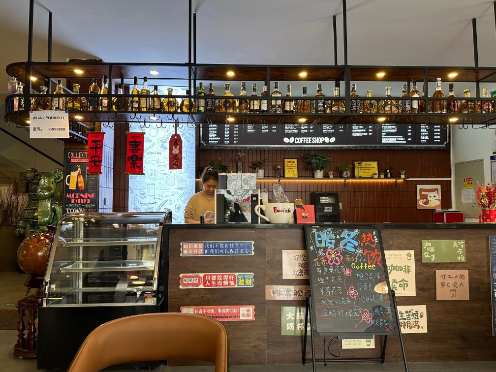 这头集市热闹非凡,另一头却有一处闹中取静的去处。沿着河防口村主路走到村北,一栋米黄色的建筑格外亮眼,这里便是村里新开的咖啡馆——雁栖湖新知咖啡厅。
