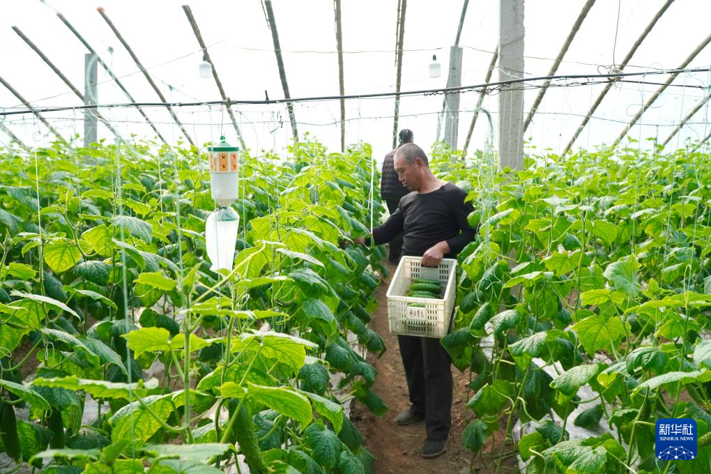 2月6日,在山东省临邑县临南镇,蔬菜大棚种植户在收获黄瓜。