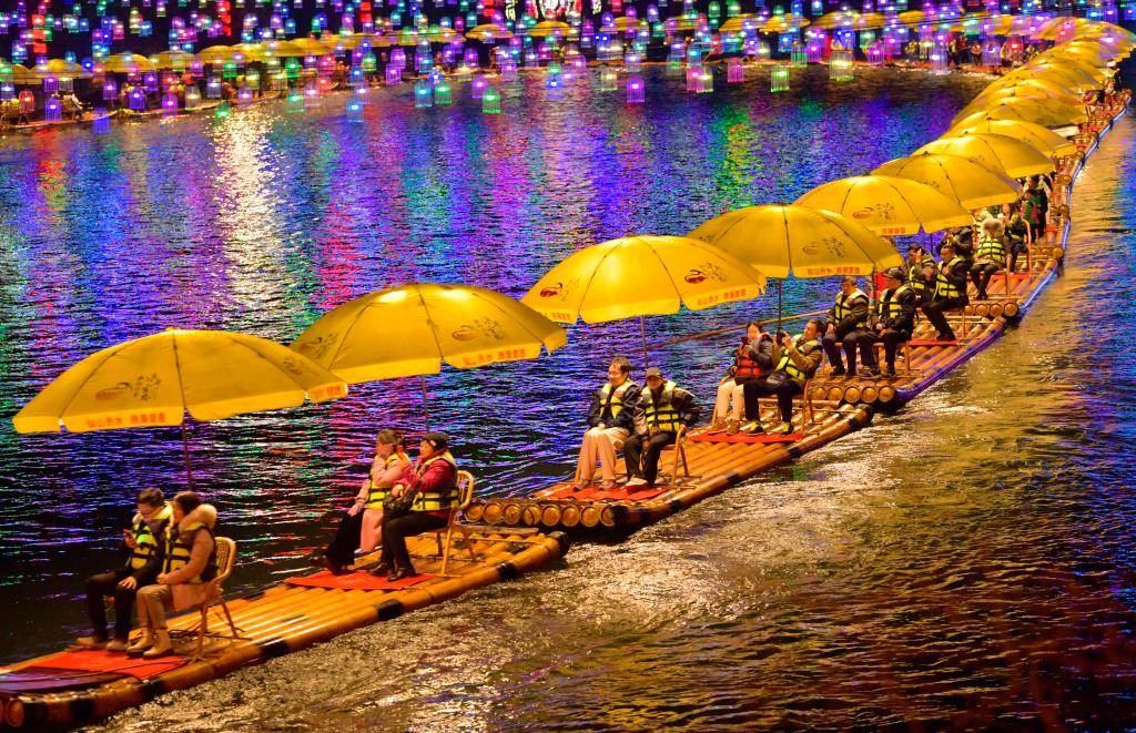 烤活鱼一条街旁的河道里,花船载歌载舞,首尾相连的竹筏宛若游龙在河道中蜿蜒前行。“龙游贡水”特色观光项目吸引了不少游客伫立岸边“看稀奇”。