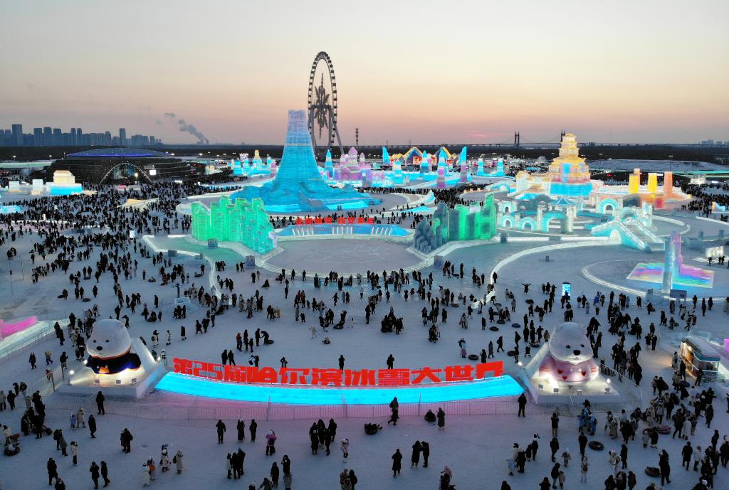 2月15日,游客在哈尔滨冰雪大世界园区内游玩(无人机照片)。新华社记者 王建威 摄